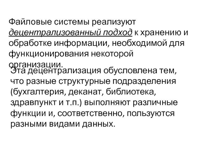 Слайд 2Файловые системы реализуют децентрализованный подход к хранению и обработке информации,