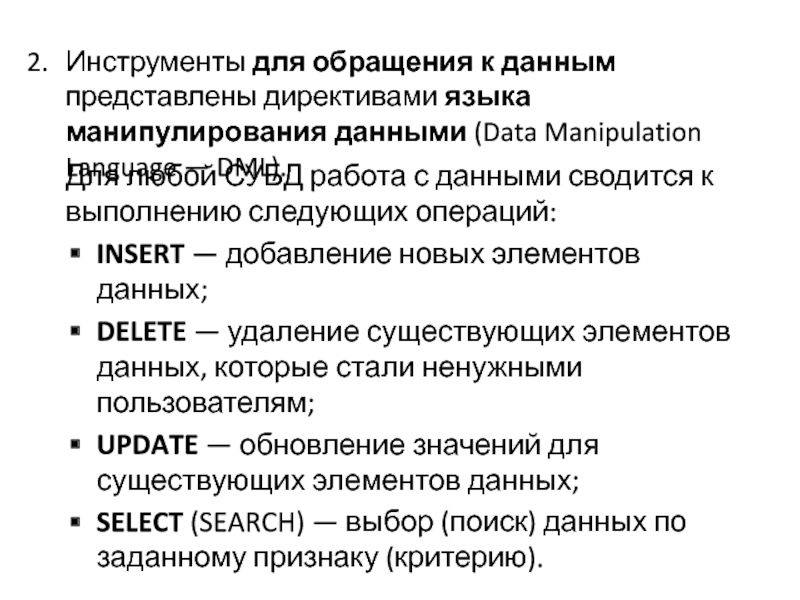 Слайд 14Инструменты для обращения к данным представлены директивами языка манипулирования данными