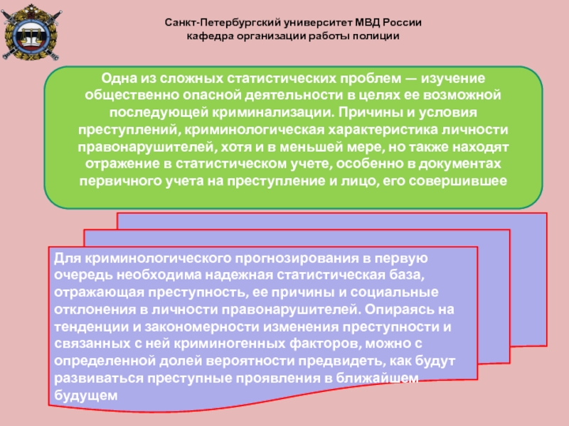 Для криминологического прогнозирования в первую очередь необходима надежная статистическая база, отражающая преступность, ее причины и социальные отклонения в личности правонарушителей. Опираясь на тенденции и закономерности изменения преступности и связанных с ней криминогенных факторов, можно с определенной долей вероятности предвидеть, как будут развиваться преступные проявления в ближайшем будущем