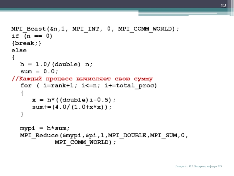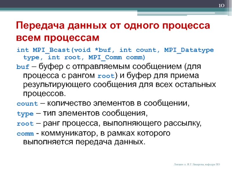 int root, MPI_Comm comm)sendbuf – буфер с отправляемым сообщением,