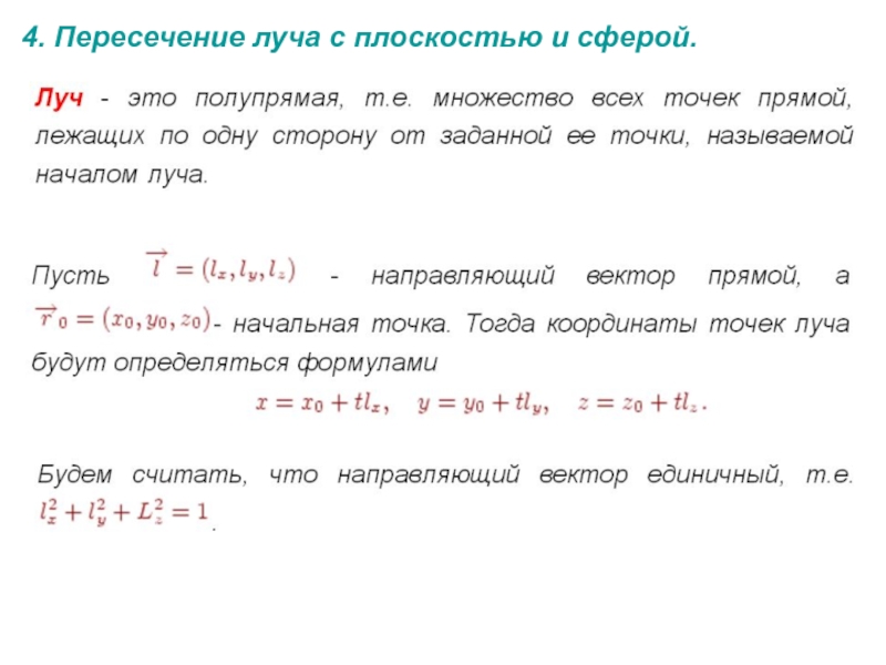 поверхностей.4. Пересечение луча с плоскостью и сферой.