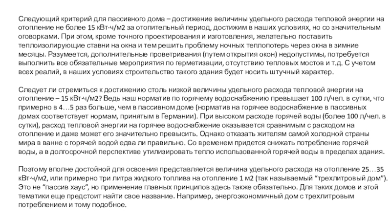 период, достижим в наших условиях, но со значительным оговорками. При этом, кроме точного проектирования и изготовления, желательно поставить теплоизолирующие ставни на окна и тем решить проблему ночных теплопотерь через окна в зимние месяцы. Разумеется, дополнительные проветривания (путем открытия окон) недопустимы, потребуется выполнить все обязательные мероприятия по герметизации, отсутствию тепловых мостов и т.д. С учетом всех реалий, в наших условиях строительство такого здания будет носить штучный характер.