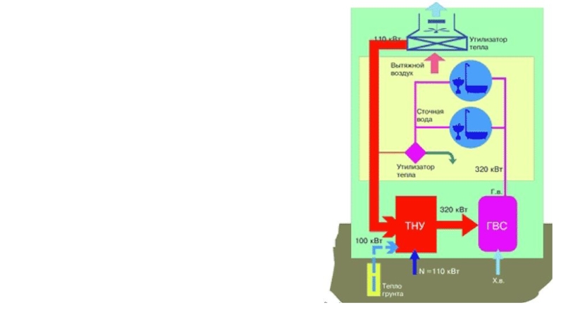Теплонасосная система горячего водоснабжения, использующая тепло грунта и утилизацию тепла сточных вод и удаляемого вентиляционного воздуха.