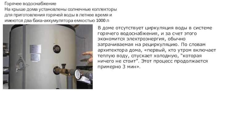 В доме отсутствует циркуляция воды в системе горячего водоснабжения, и за счет этого экономится электроэнергия, обычно затрачиваемая на рециркуляцию. По словам архитектора дома, «первый, кто утром включает теплую воду, спускает холодную, “которая ничего не стоит”. Этот процесс продолжается примерно 3 мин».