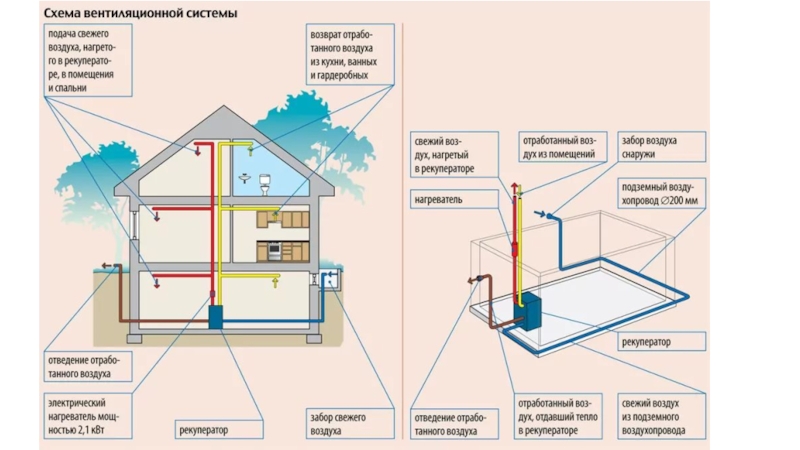 Вентиляция в доме центральная механическая приточно-вытяжная, с рекуперацией теплоты удаляемого