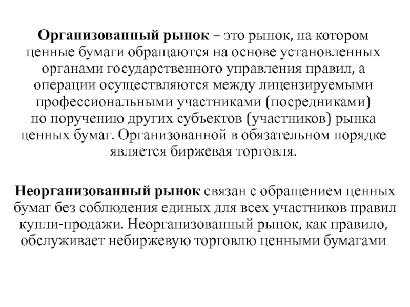 Неорганизованный рынок связан с обращением ценных бумаг без соблюдения единых для всех участников правил купли-продажи. Неорганизованный рынок, как правило, обслуживает небиржевую торговлю ценными бумагами