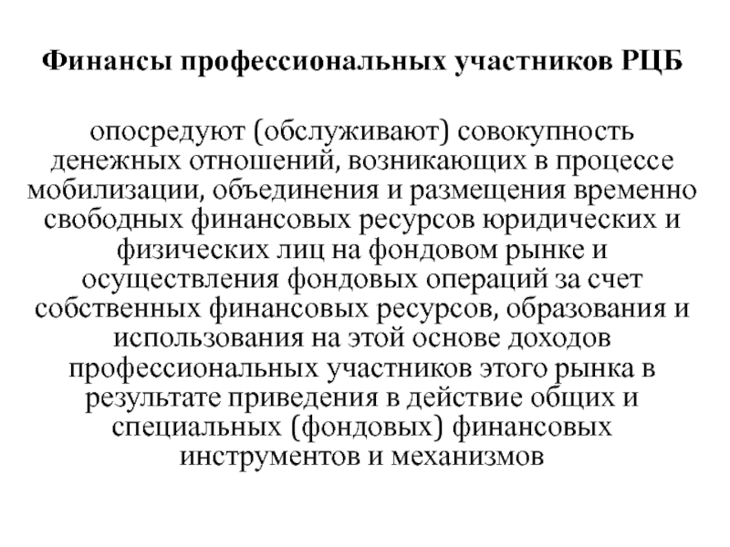 юридических и физических лиц на фондовом рынке и осуществления фондовых операций за счет собственных финансовых ресурсов, образования и использования на этой основе доходов профессиональных участников этого рынка в результате приведения в действие общих и специальных (фондовых) финансовых инструментов и механизмов