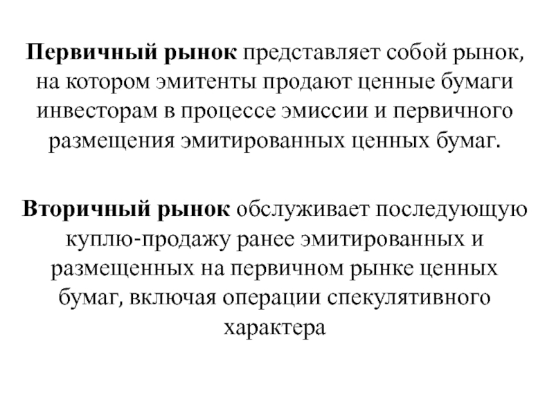 Вторичный рынок обслуживает последующую куплю-продажу ранее эмитированных и размещенных на первичном рынке ценных бумаг, включая операции спекулятивного характера