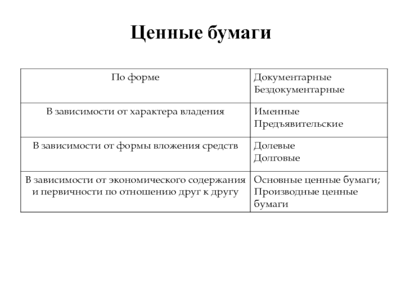 Основные: акции, облигации, векселя, депозитные (сберегательные) сертификаты