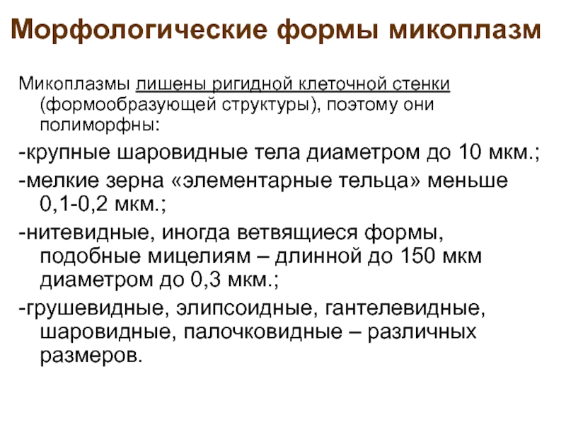 Микоплазмы лишены ригидной клеточной стенки (формообразующей структуры), поэтому