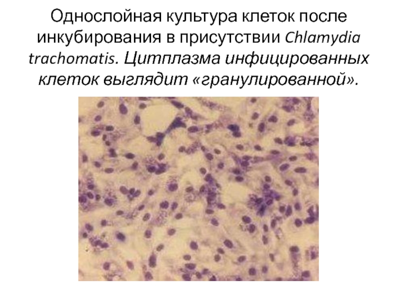Слайд 72C.trachomatis в пораженных клетках методом прямой иммунофлюоресценции – зеленые включения