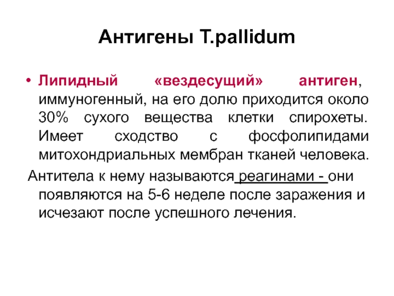 Антитела к нему называются реагинами - они появляются на 5-6 неделе после заражения и исчезают после успешного лечения.