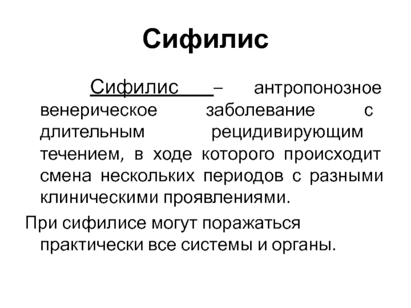 Сифилис – антропонозное венерическое заболевание с длительным рецидивирующим течением,