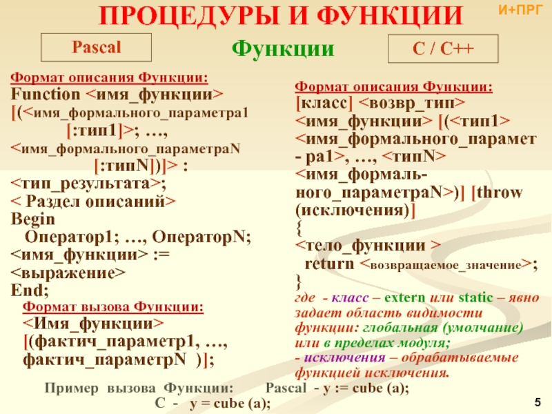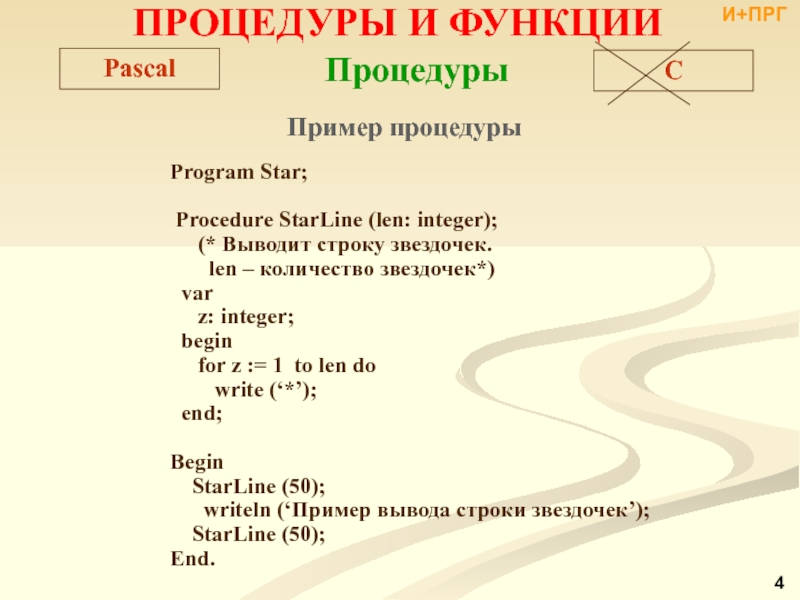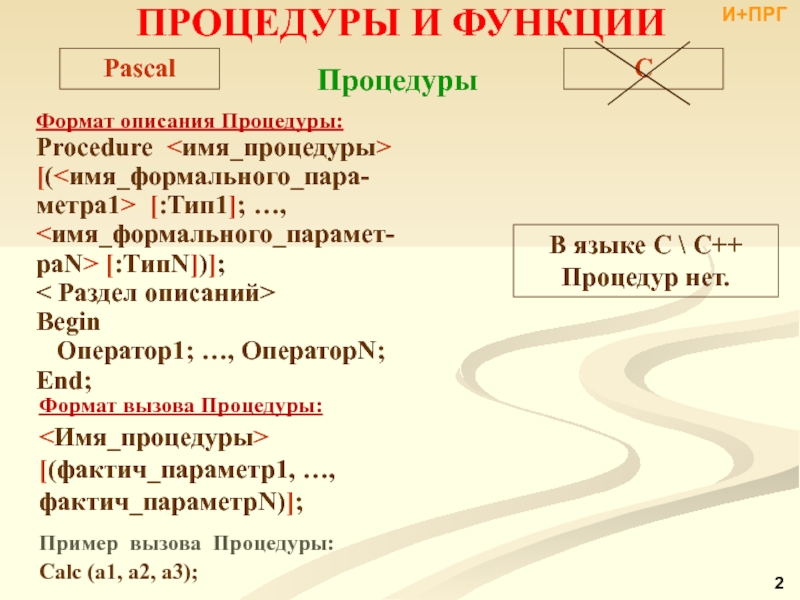 ![Процедуры и функции Формат описания Процедуры:Procedure [( [:Тип1]; …, [:ТипN])];< Раздел описаний>Begin Оператор1; Формат описания Процедуры:Procedure [( [:Тип1]; …, [:ТипN])];< Раздел описаний>Begin Оператор1; …, ОператорN;End; В языке С](/img/tmb/2/148780/5376ef662a7b8c861d934f86df94c914-800x.jpg)
