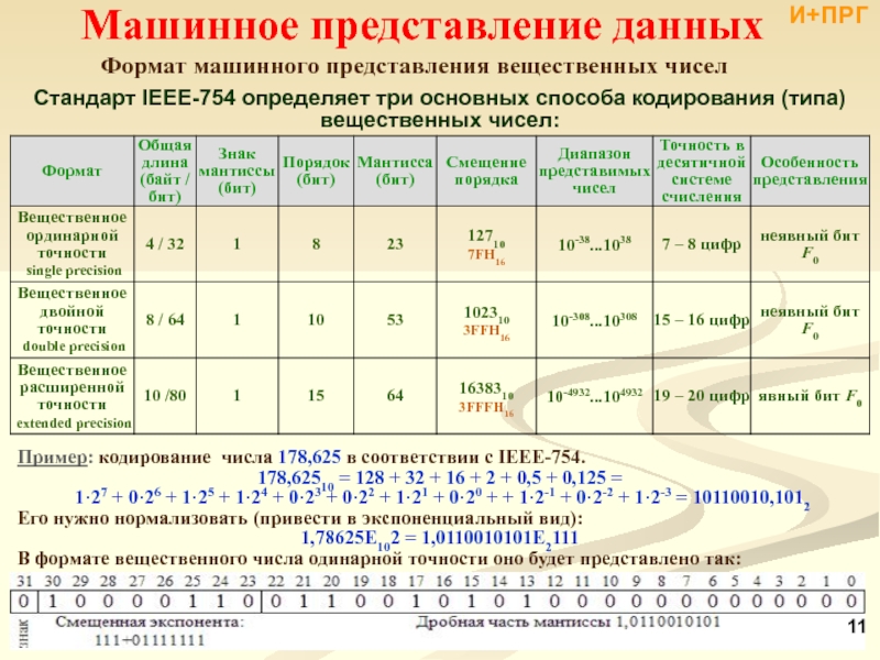 Машинное представление данныхФормат машинного представления вещественных чиселПример: кодирование числа 178,625 в соответствии с IEEE-754. 178,62510 = 128