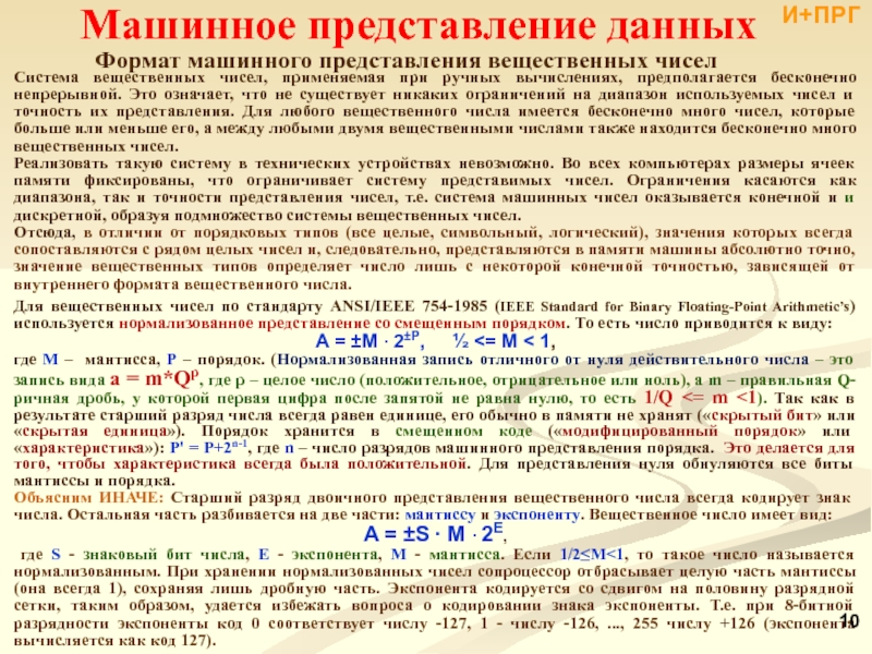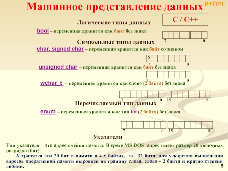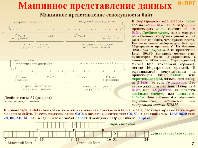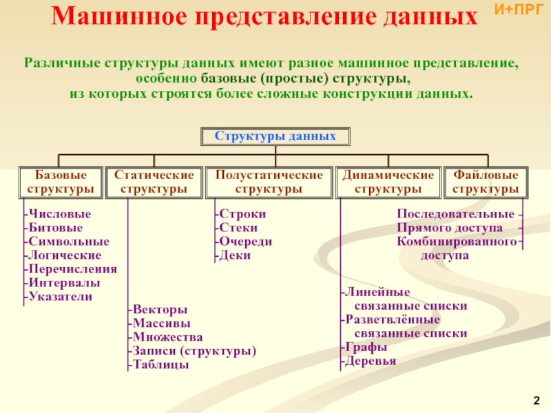Машинное представление данныхРазличные структуры данных имеют разное машинное представление, особенно базовые (простые) структуры, из которых строятся более сложные конструкции данных.И+ПРГ