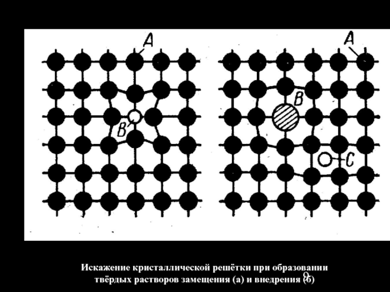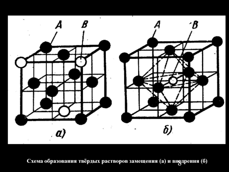 Слайд 8Схема образования твёрдых растворов замещения (а) и внедрения (б)