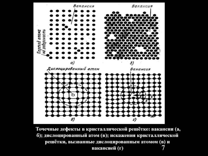 Точечные дефекты в кристаллической решётке: вакансии (а, б); дислоцированный атом