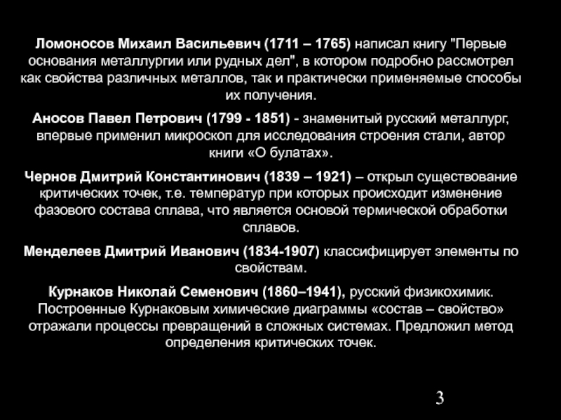 Чернов Дмитрий Константинович (1839 – 1921) – открыл существование критических точек, т.е. температур при которых происходит изменение фазового состава сплава, что является основой термической обработки сплавов.