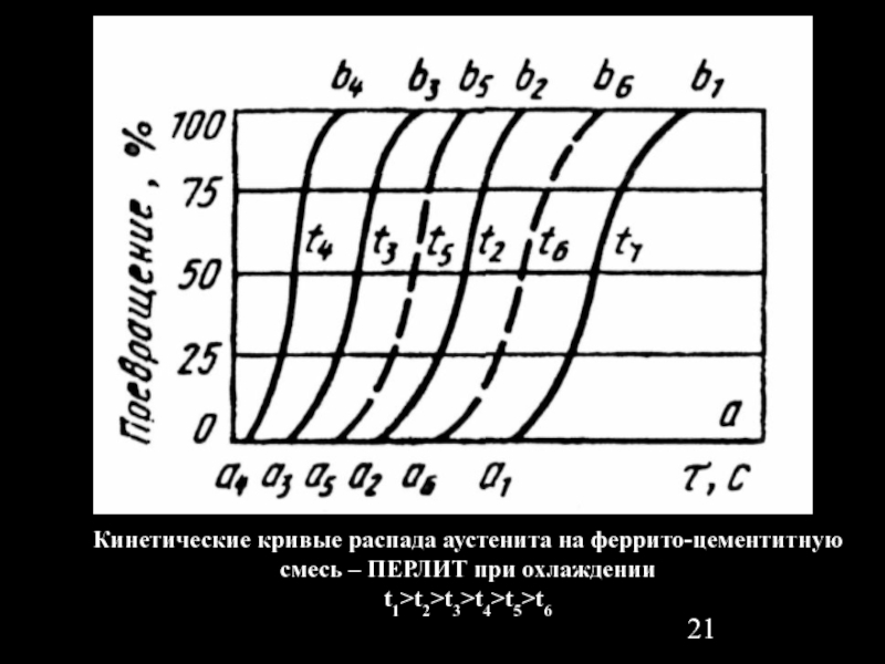Слайд 21Кинетические кривые распада аустенита на феррито-цементитную