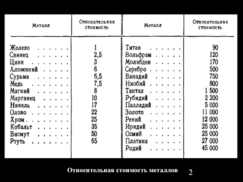 Слайд 2Относительная стоимость металлов