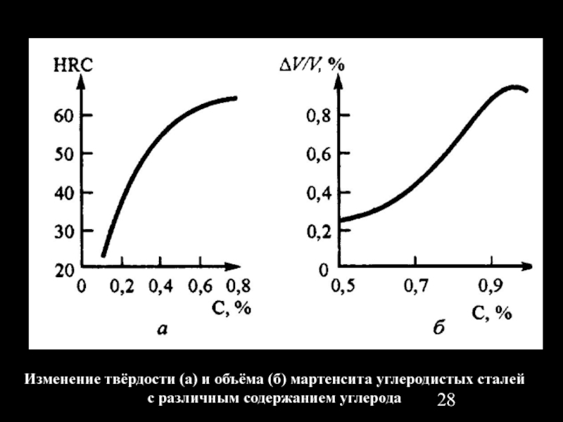 Слайд 28Изменение твёрдости (а) и объёма (б) мартенсита углеродистых сталей