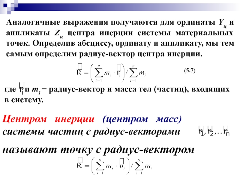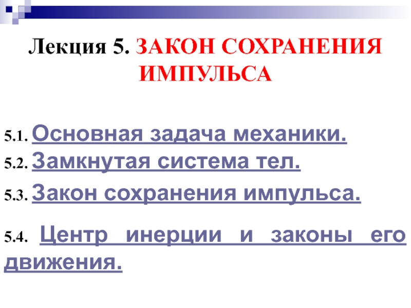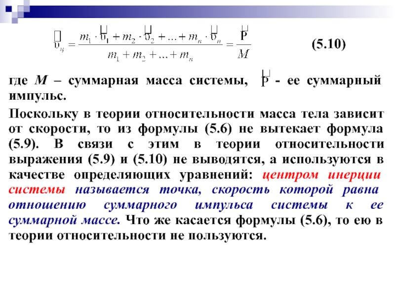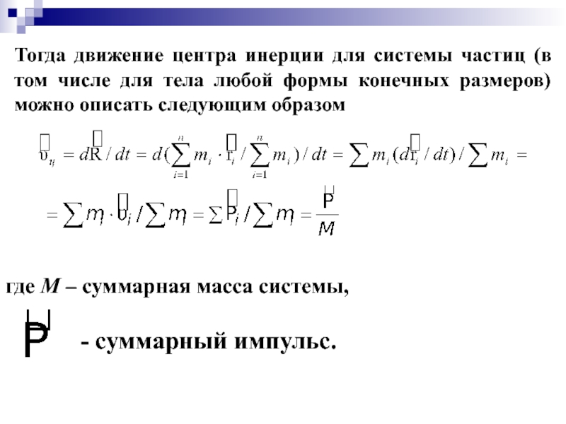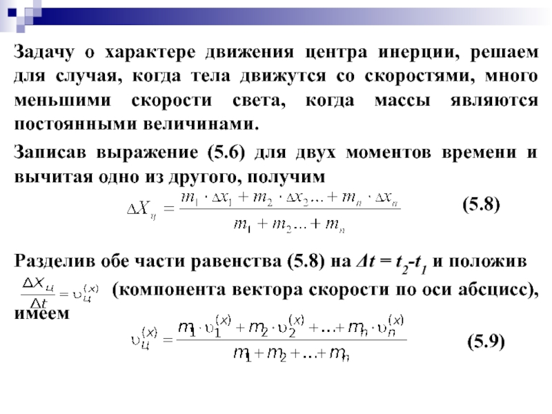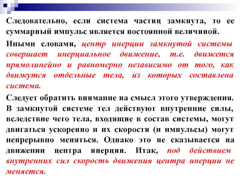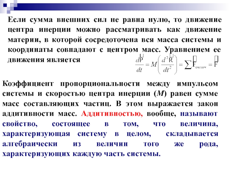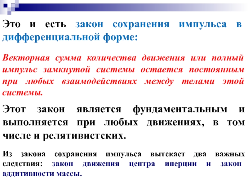 Из закона сохранения импульса вытекает два важных следствия: закон движения центра инерции и закон аддитивности массы.