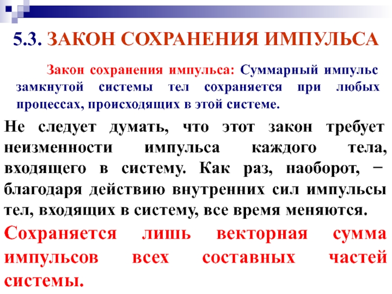 Сохраняется лишь векторная сумма импульсов всех составных частей системы.