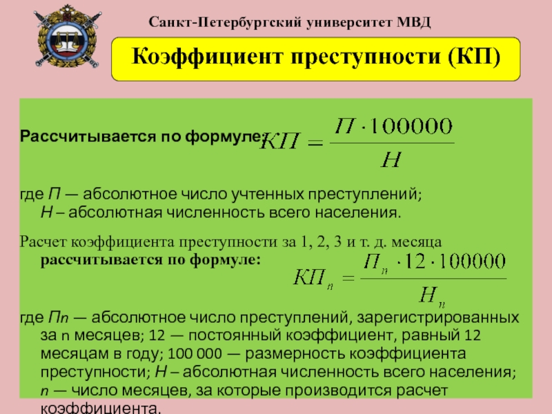 Совокупность различных коэффициентов помогает более объективно оценивать уровень преступности и ее видов и сравнивать их во времени (по годам) и в пространстве (по территориям).