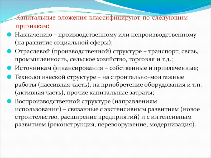 Слайд 8Капитальные вложения классифицируют по следующим признакам: