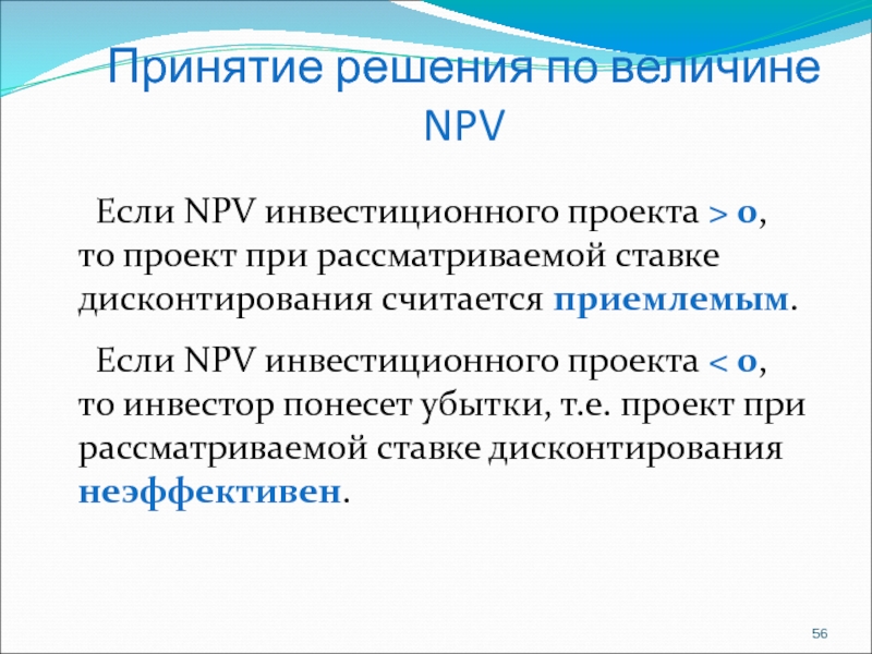Слайд 56Принятие решения по величине NPV