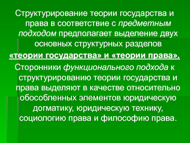 Слайд 42Структурирование теории государства и права в соответствие с предметным подходом