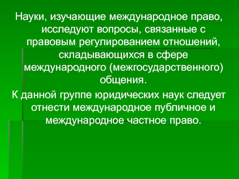 Слайд 36Науки, изучающие международное право, исследуют вопросы, связанные с правовым регулированием