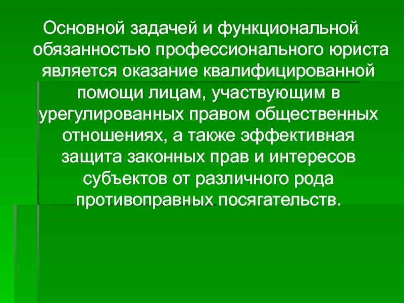 Слайд 44Основной задачей и функциональной обязанностью профессионального юриста является оказание квалифицированной