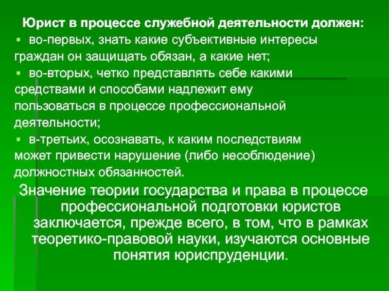 Значение теории государства и права в процессе профессиональной подготовки юристов заключается, прежде всего, в том, что в рамках теоретико-правовой науки, изучаются основные понятия юриспруденции.