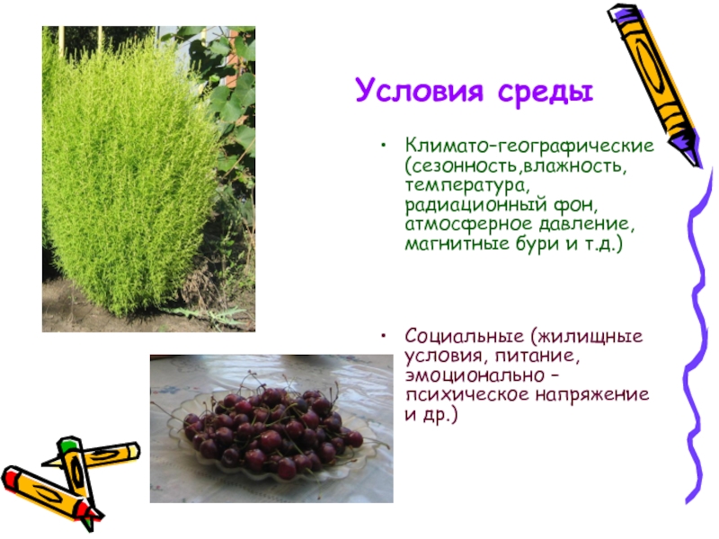 Климато–географические (сезонность,влажность, температура, радиационный фон, атмосферное давление, магнитные бури