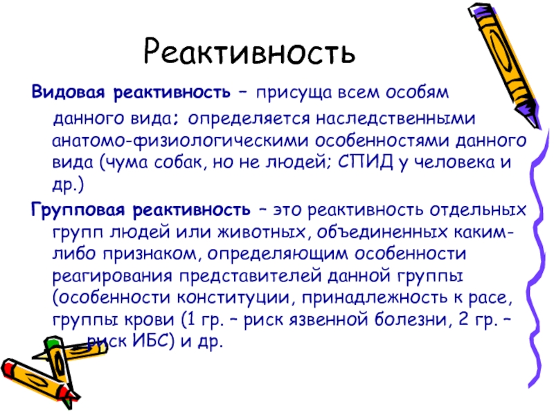 Групповая реактивность – это реактивность отдельных групп людей или животных, объединенных каким-либо признаком, определяющим особенности реагирования представителей данной группы (особенности конституции, принадлежность к расе, группы крови (1 гр. – риск язвенной болезни, 2 гр. – риск ИБС) и др.