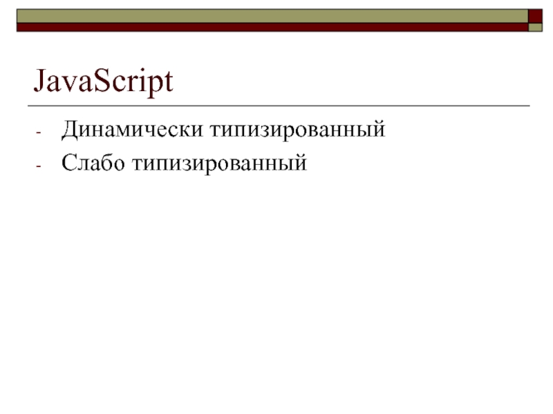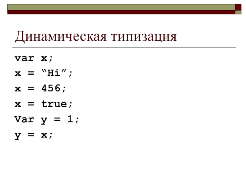 Динамическая типизацияvar x;x = “Hi”;x = 456;x = true;Var y = 1;y = x;