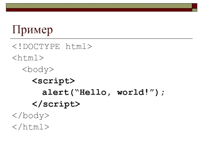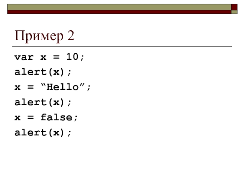 Пример 2var x = 10;alert(x);x = “Hello”;alert(x);x = false;alert(x);