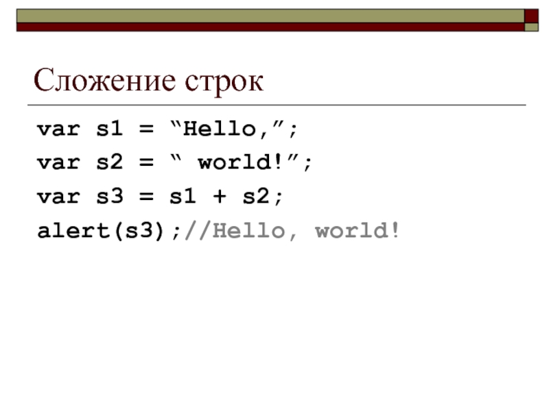 Сложение строкvar s1 = “Hello,”;var s2 = “ world!”;var s3 = s1 + s2;alert(s3);//Hello, world!
