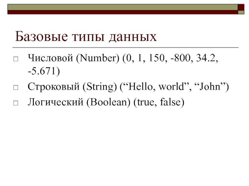 Базовые типы данныхЧисловой (Number) (0, 1, 150, -800, 34.2, -5.671)Строковый (String) (“Hello, world”, “John”)Логический (Boolean) (true, false)