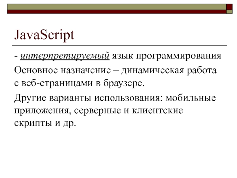 JavaScript- интерпретируемый язык программированияОсновное назначение – динамическая работа с веб-страницами в браузере.Другие варианты использования: мобильные приложения, серверные и клиентские скрипты и др.
