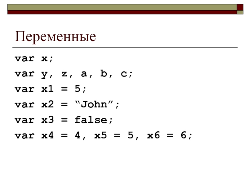 Переменныеvar x;var y, z, a, b, c;var x1 = 5;var x2 = “John”;var x3 = false;var x4