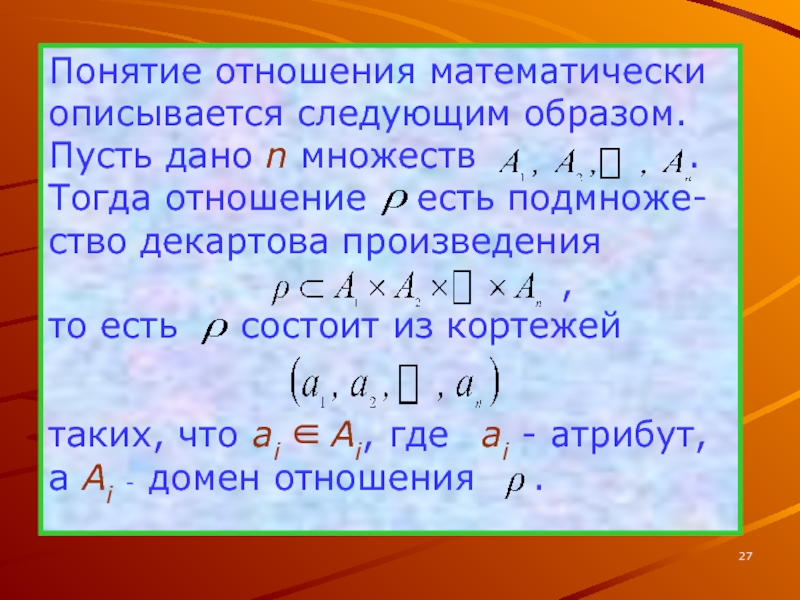 Слайд 27Понятие отношения математически описывается следующим образом.