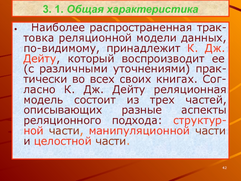 различными уточнениями) прак-тически во всех своих книгах. Сог-ласно К. Дж. Дейту реляционная модель состоит из трех частей, описывающих разные аспекты реляционного подхода: структур-ной части, манипуляционной части и целостной части.