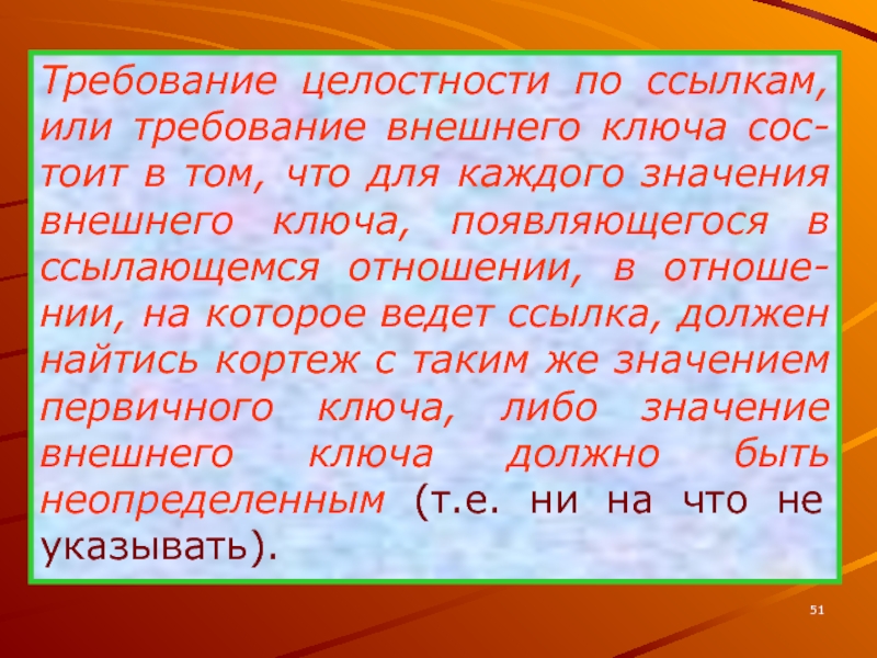 Слайд 51Требование целостности по ссылкам, или требование внешнего ключа сос-тоит в