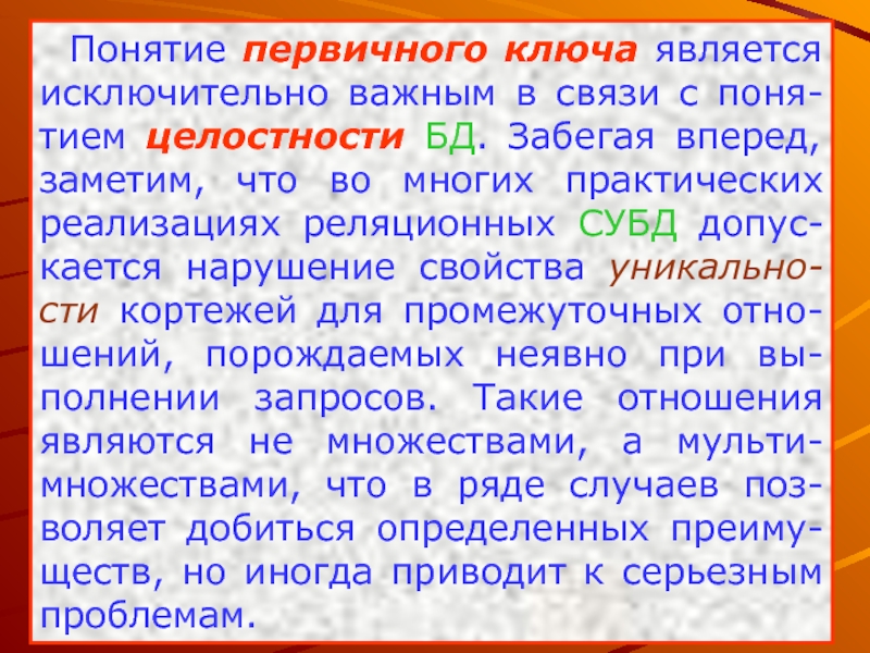 есть другими сло-вами, любое отношение должно обладать первичным ключом. Это требование автоматически удовлетворяется, если в системе не нарушаются базовые свой-ства отношений.