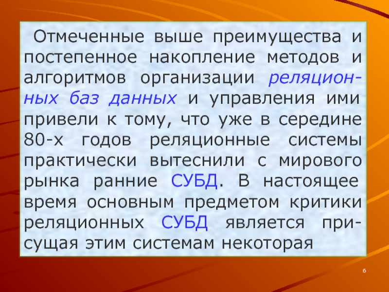 уже в середине 80-х годов реляционные системы практически вытеснили с мирового рынка ранние СУБД. В настоящее время основным предметом критики реляционных СУБД является при-сущая этим системам некоторая