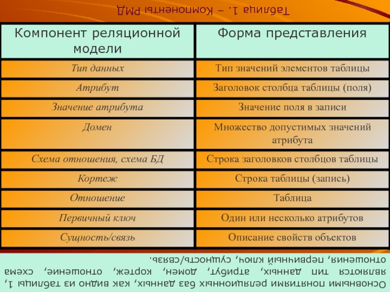 (relation). Компоненты РМД и формы их представления можно изобразить в виде нижеследующей таблицы.