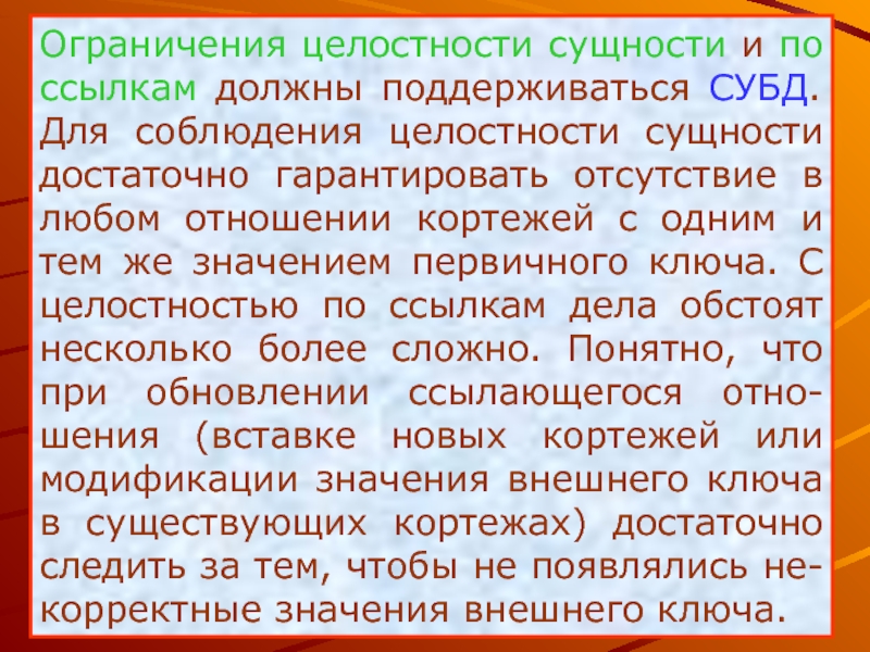 Слайд 50Ограничения целостности сущности и по ссылкам должны поддерживаться СУБД. Для